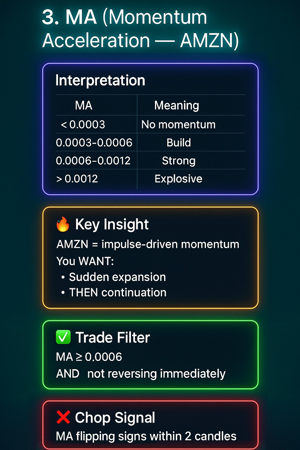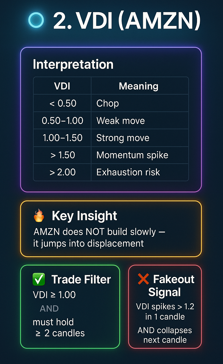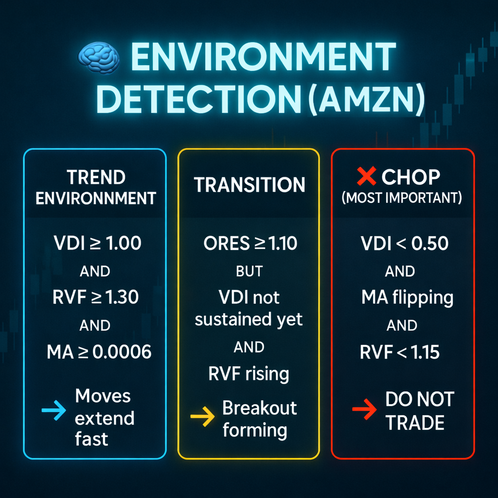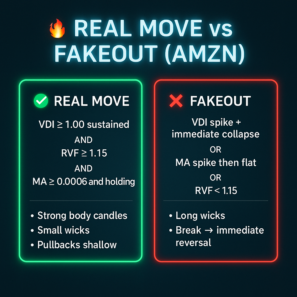 Only trade AMZN when volume spikes, price expands away from VWAP, and momentum follows through — otherwise stay out