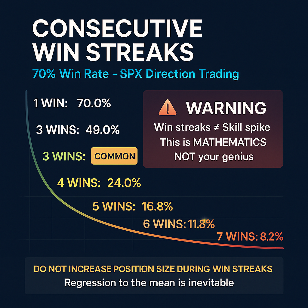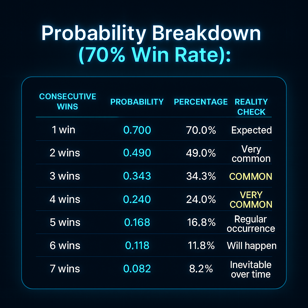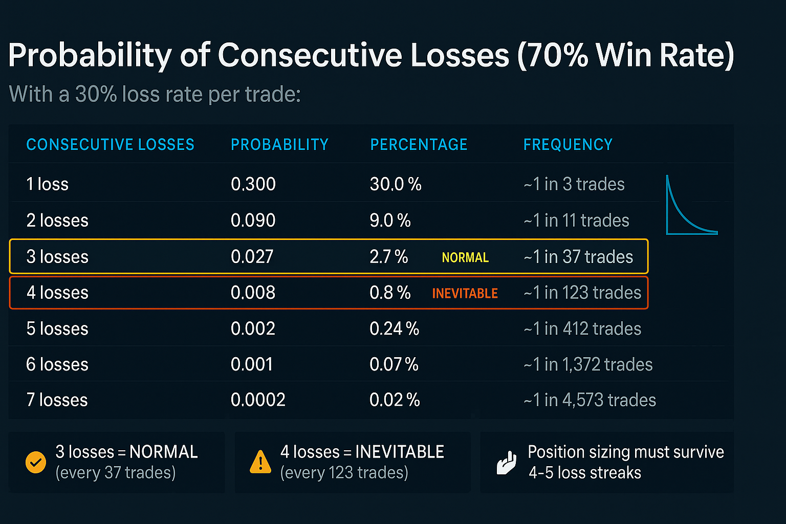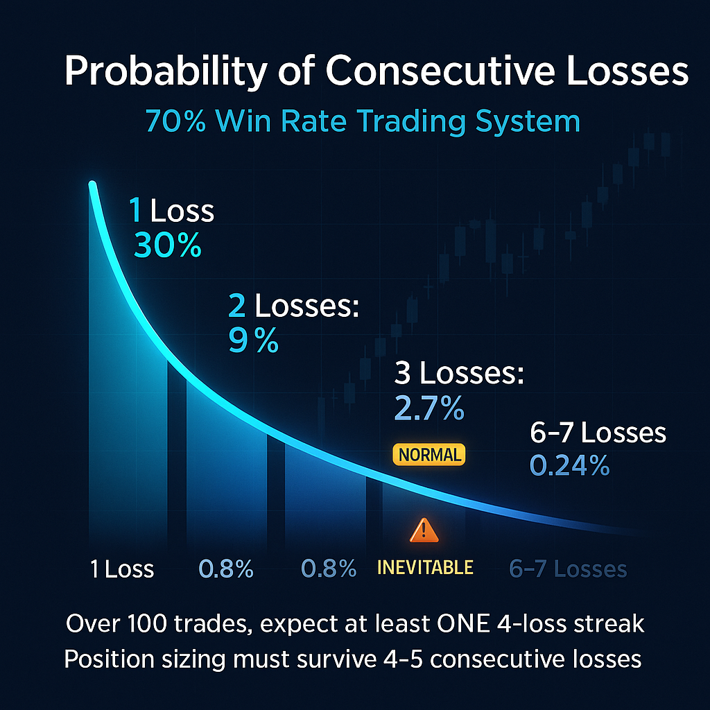 Even with a 70% edge, your position sizing must withstand at least 4-5 consecutive losses to survive long-term trading.