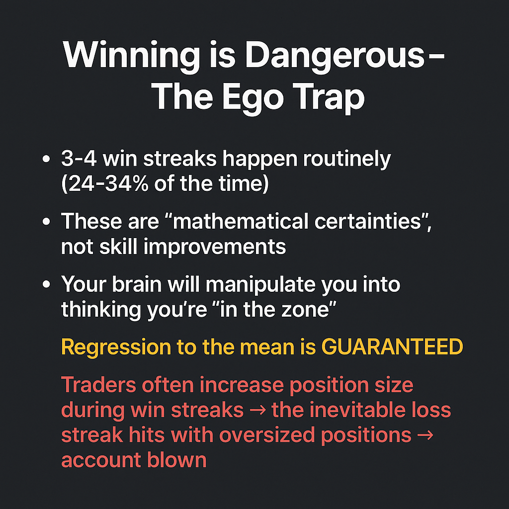 Traders often increase position size during win streaks → the inevitable loss streak hits with oversized positions → account blown