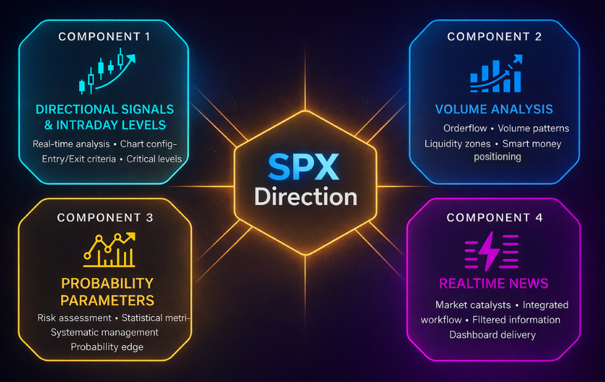 The SPX Direction Algorithm delivers a comprehensive analytical framework through an integrated dashboard architecture designed for precision intraday decision-making.