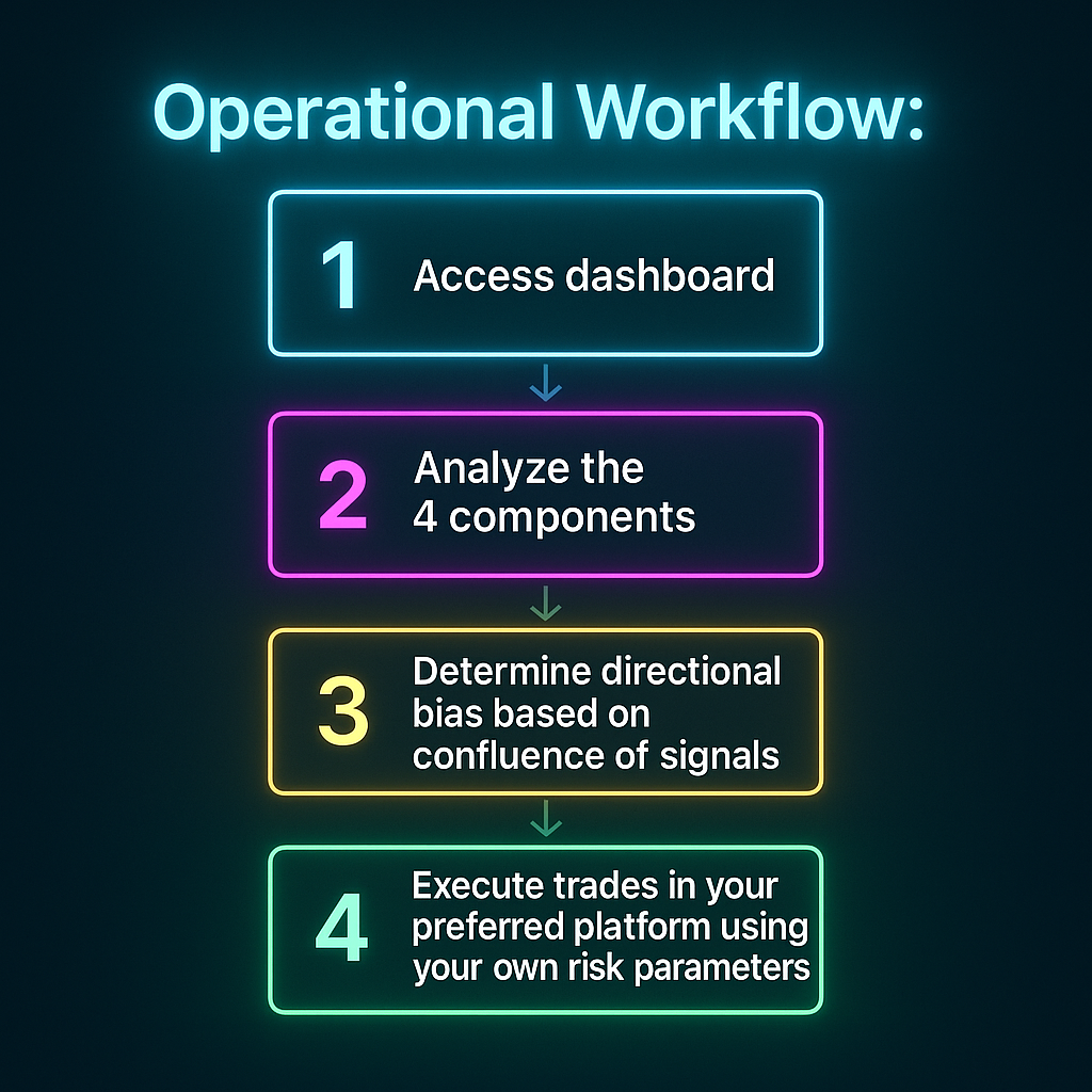 The system provides the analytical framework. You maintain complete control over execution, instrument traded, type of product (futures / options), position sizing, and risk management.