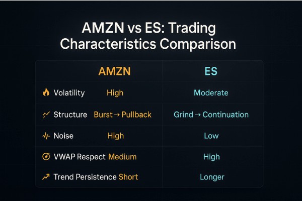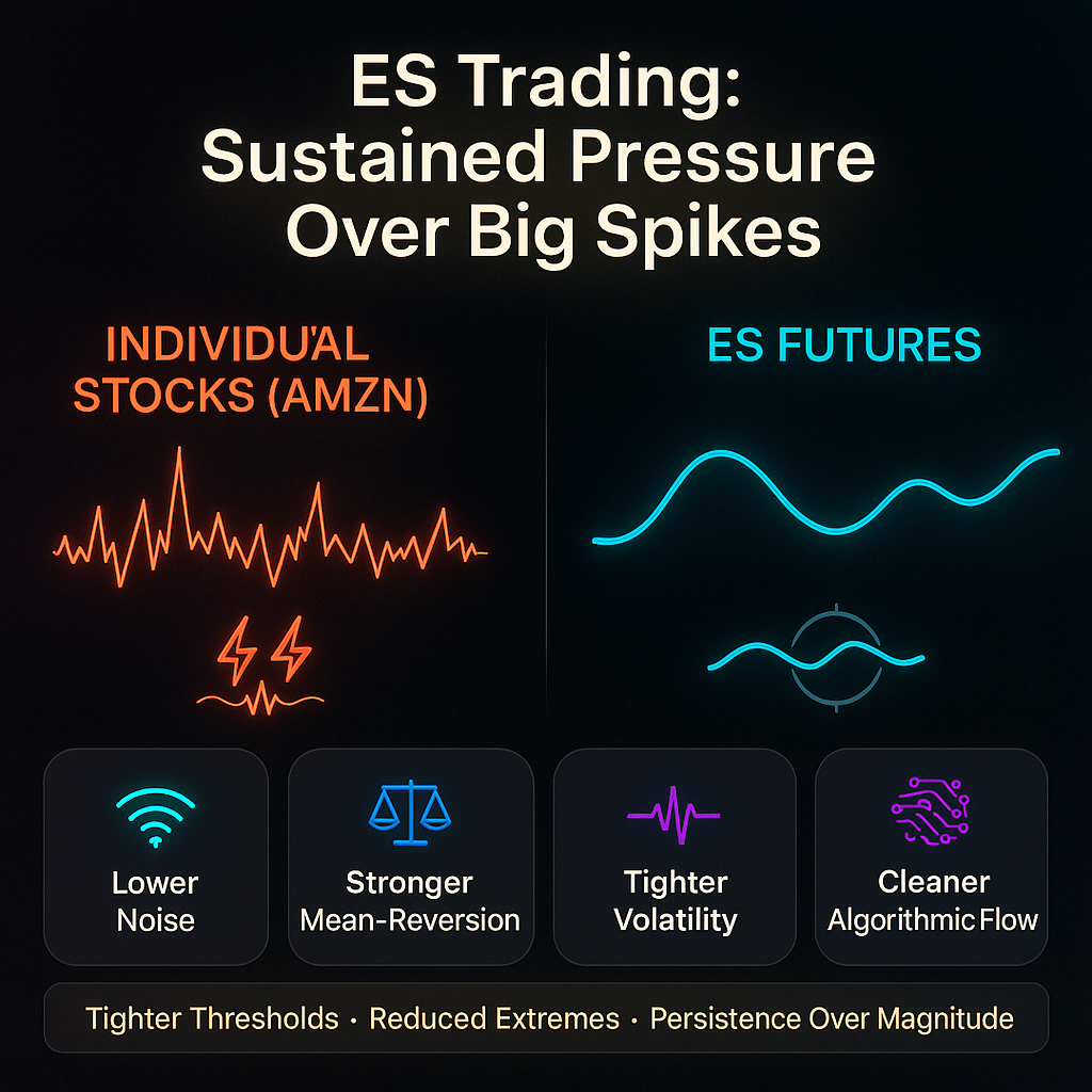 For ES, you don’t need big spikes unlike individual stocks - you need sustained pressure. Trading E-mini S&P 500 Futures (ES) using our dashboard is different from trading individual stocks like AMZN because of: