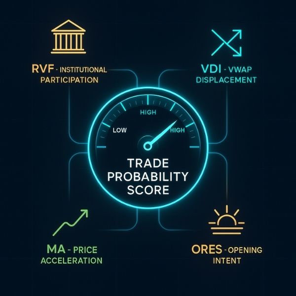 Our 4 probability parameters are RVF (conviction), VDI (direction), MA (acceleration) and ORES (origination), all of these are combined into a “Trade Probability Score” (execution).